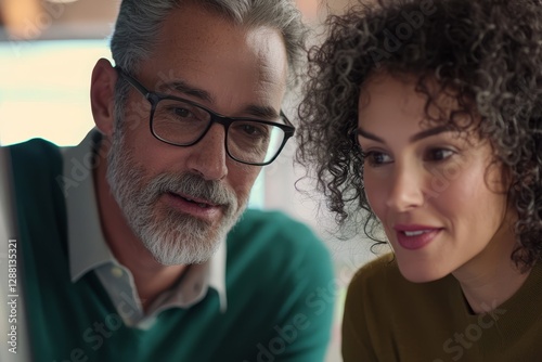 A team of colleagues gathered around a desktop computer engaged in conversation