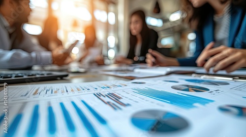 A team of diverse individuals engaged in discussion around a conference table, with charts and budgets laid out, under bright LED lighting.