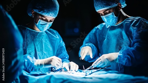 A team of doctors and nurses performing a delicate surgery, advanced medical instruments in use