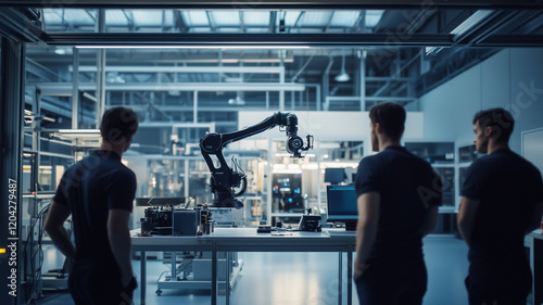 A team of engineers carefully observing a robotic arm in action inside a modern industrial manufacturing facility, the environment is brightly lit with high-tech machinery in the background