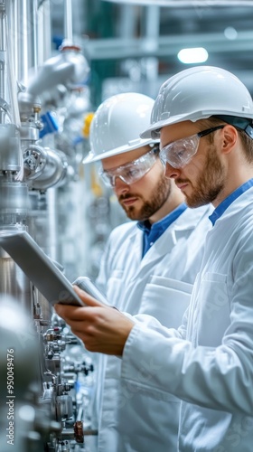 A team of engineers in a high-tech manufacturing facility, inspecting machinery and discussing production processes, with industrial equipment in the background
