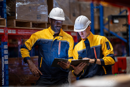 A team of engineers inspects the warehouse in a large storage warehouse. The inspection team uses electronic equipment to monitor the stored goods. staff are in safe working clothes in clean factory.