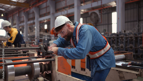 A team of factory technician use a wrench to inspect the conveyor belt of the metal sheet production machine.
