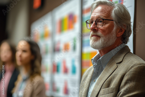 A team of professionals in a meeting, exchanging ideas with charts and graphs on the wall