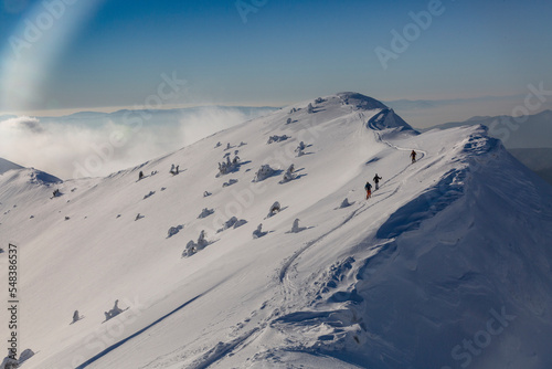 A team of ski mountaineers climbs to the top of a snow-capped mountain on a backcountry terrain