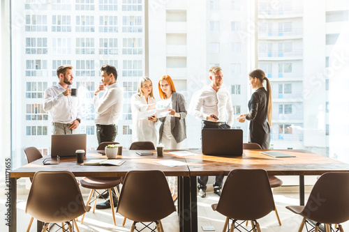 A team of young businessmen working and communicating together in an office. Corporate businessteam and manager in a meeting. desktop against the background of the pan window, free space for text