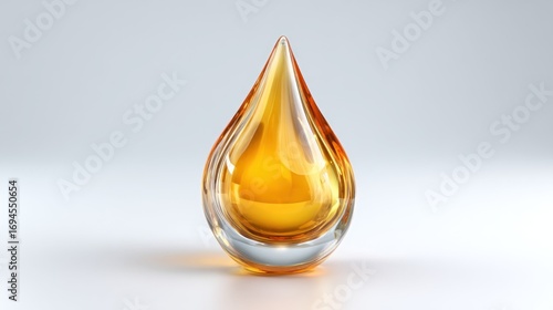 A teardrop-shaped, amber-hued glass object with transparent accents sits gracefully on a neutral background.