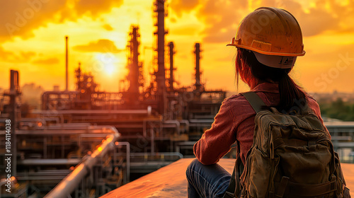 A technician in a hard hat and protective gear watches the sun set behind towering industrial structures. The sky is painted in vibrant hues of orange and yellow, signaling the day's end.