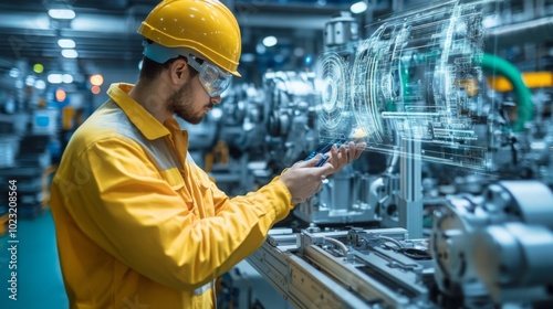 A technician in a yellow hard hat works with machinery, displaying augmented reality data in a modern manufacturing setup.