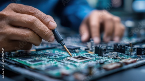 A technician inspects a circuit board with precision, using a probe to test connections in an electronics lab filled with tools and equipment. The focus is on their skilled hands and components