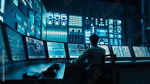 A technician sits at a high-tech control panel with multiple screens displaying data and graphs, working in a modern, illuminated control room.