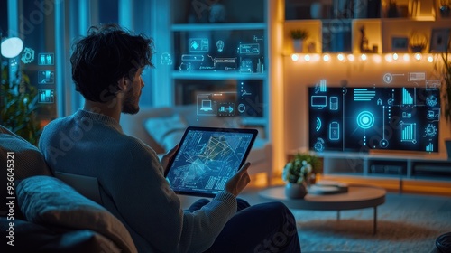 A tech-savvy individual controlling a smart home environment using a sleek tablet, adjusting lights, security, and entertainment settings with ease, surrounded by modern furniture and high-tech
