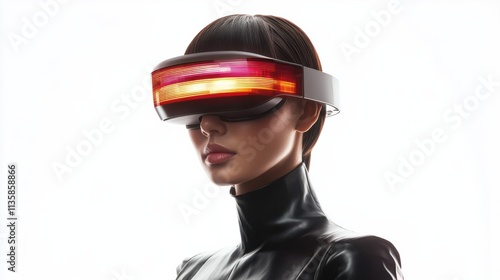A tech-savvy woman in sleek attire wearing a glowing digital headset with augmented reality effects, isolated on white