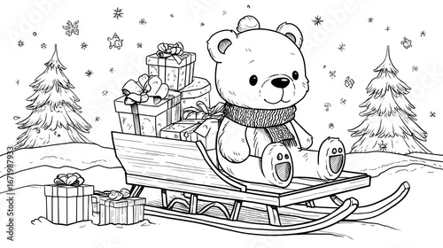 A teddy bear in a sleigh with gifts, amidst winter scenery