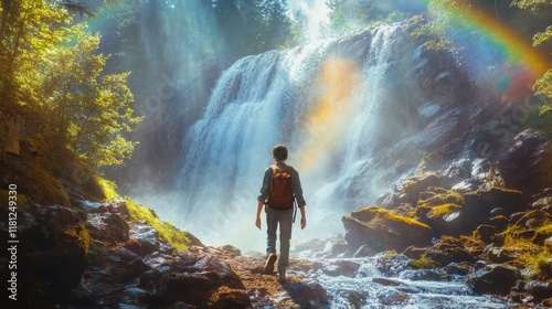A teenage boy with a hearing aid walking beside a waterfall misty rainbows forming