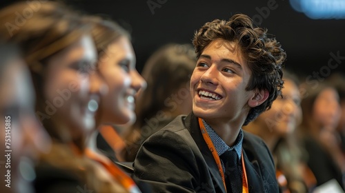 A teenage boy with a joyful smile engaging with peers at an interactive youth leadership conference.