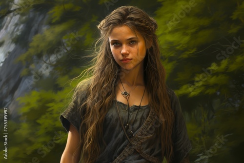 A teenage Cro-Magnon girl with olive skin, long wavy hair, collecting wild berries in a dense forest. She wears simple leather garments, and her expression of focus and joy illuminates the connection