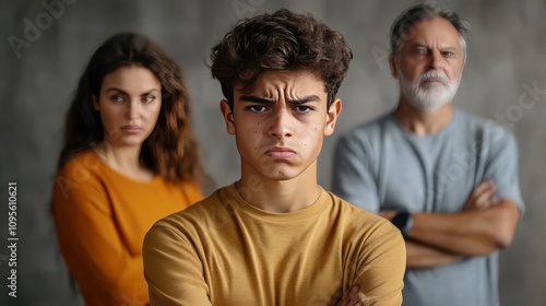 A teenager with an angry face, standing with their back to their parents, arms crossed and unwilling to speak.