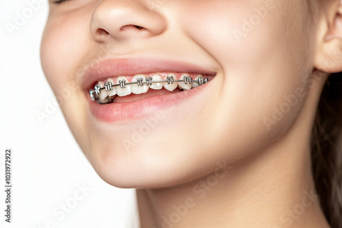 a teen's smile, showcasing braces and aligned teeth