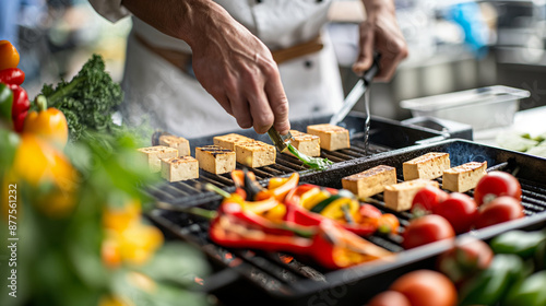A telephoto angle photo of a chef demonstrating how to grill tofu and vegetables at a community cookout, emphasizing plant-based eating and culinary education, environmental scient