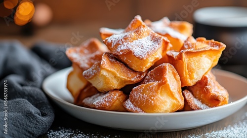 A tempting assortment of golden pastries dusted with powdered sugar, arranged on a plate, evoking a sense of indulgence, satisfaction, and culinary delight.