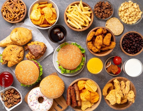 A tempting assortment of popular fast food and processed snacks, representing a concept of unhealthy diet choices and overconsumption