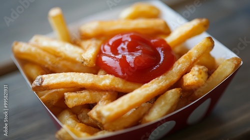 A tempting serving of golden French fries is paired with a side of rich, tangy ketchup, creating a mouthwatering combination.