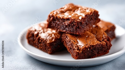A tempting stack of freshly baked brownies arranged on a pristine white plate, highlighting their moist, rich texture and glossy surface perfect for dessert lovers.