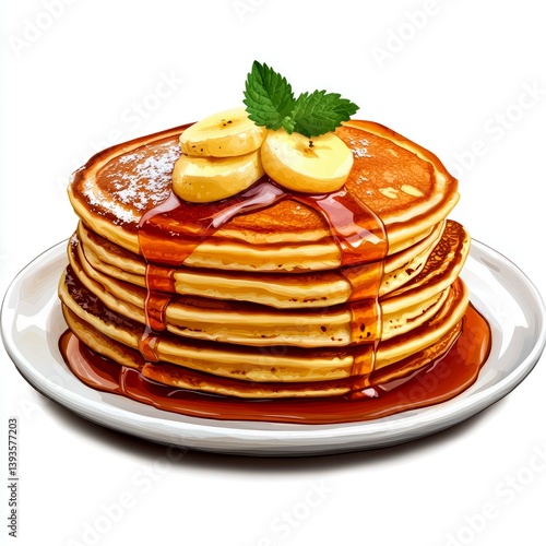 A tempting stack of pancakes, drizzled with syrup and topped with fresh banana slices. The perfect breakfast or dessert treat!