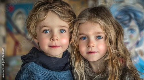 A tender moment between a boy and a girl, their eyes looking into the camera with innocence and warmth.