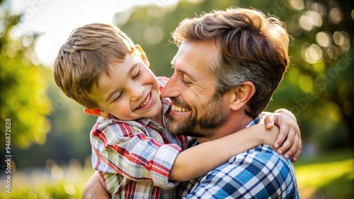 A tender moment captures a smiling dad embracing his little boy, both beaming with joy, as they share a heartwarming bonding experience outdoors.