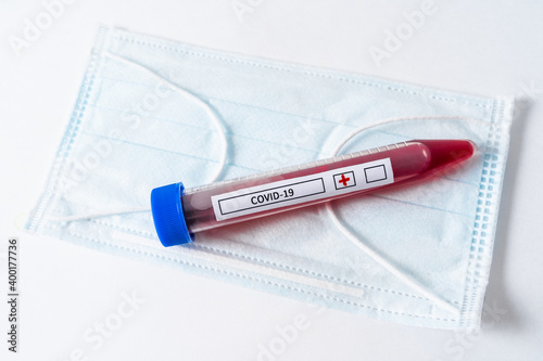 A test tube with a virus infected blood lying on a mask