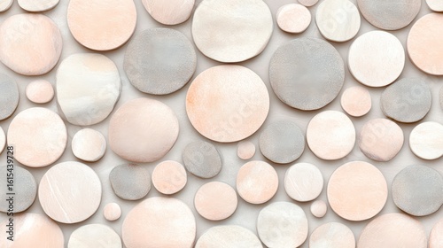 A textured arrangement of circular stones in soft peach and gray hues, suitable for backgrounds in design projects, home decor, or branding materials, conveying a sense of calm and elegance,