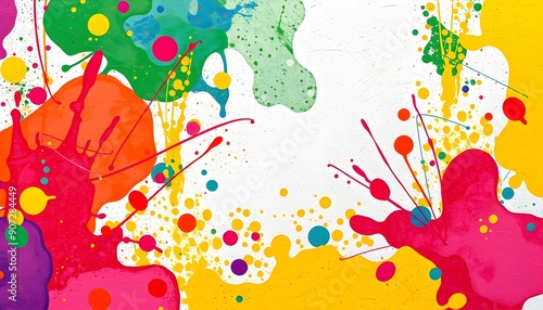 A textured background with bold, irregular shapes and splatters of paint in a variety of bright colors, evoking a sense of energetic creativity. Multiple variations available