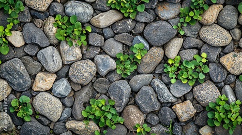 A Textured Mosaic of Smooth Stones Interspersed with Tiny Green Plants, Creating a Harmonious Blend of Nature and Earthy Elements in an Outdoor Setting