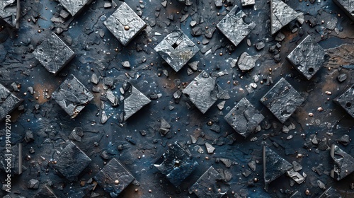 A textured surface featuring dark, square shapes and scattered stones, creating an industrial aesthetic.