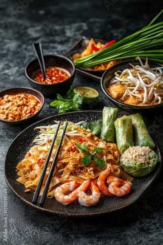 A Thai street food stall serving pad thai, spring rolls, and bowls of spicy tom yum soup