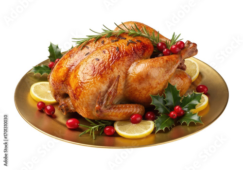 A Thanksgiving Or a Christmas Turkey on a Golden Serving Dish, Cut Out, Clipping Path, Isolated on a Transparent PNG Background.