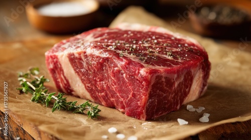A thick cut of marbled steak rests on brown parchment paper. Fresh herbs and coarse salt surround the meat highlighting its quality and inviting preparation for grilling.