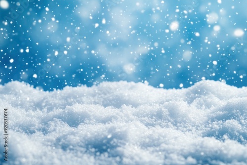 A thick layer of snow on blue background. Christmas and winter holidays product podium or background with snow texture with generative ai