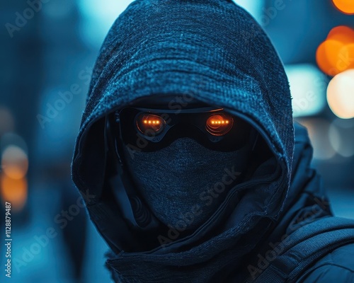 A thief caught midtheft by a glowing security camera, their face obscured by a mask, cinematic depth
