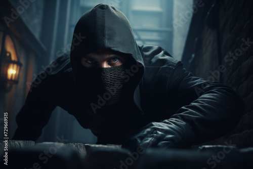 A thief is spying, waiting for the right moment to steal, the environment is in dark colors, the thief hides his face between his clothes. He watches intently.