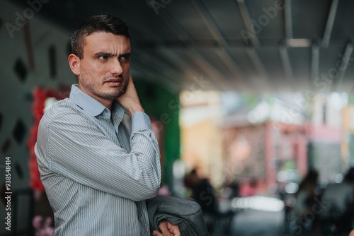 A thoughtful businessman in a striped shirt stands in an outdoor setting, exuding confidence and contemplation. The blurred background suggests a busy, contemporary urban environment.