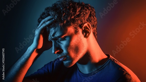 A thoughtful young man in a dramatic light, expressing deep emotions with a hand on his forehead, showcasing contemplation and introspection.