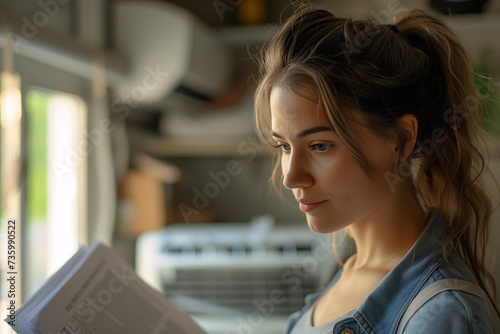 A thoughtful young woman engrossed in reading a document by the soft natural light near a window.