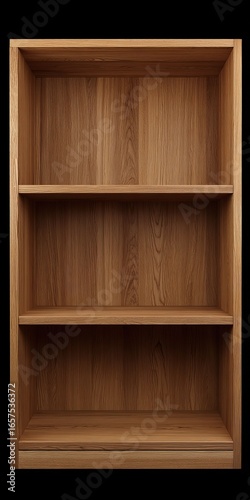 A three-tiered, wooden bookcase, showcasing the grain of the wood and its symmetrical structure