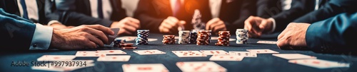 A thrilling poker game unfolds with players engaged at a table, surrounded by chips and cards. The atmosphere is filled with excitement and strategy.