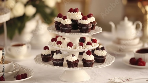 A tiered display of chocolate cupcakes topped with cream and raspberries, perfect for a tea party.