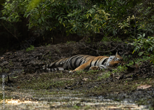 A tiger cubs sleeping near a water body at Panna Tiger Reserve, Madhya pradesh, India