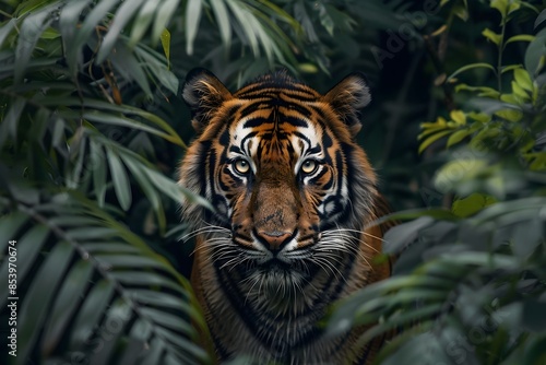 A tiger in a dense jungle, majestic, powerful, sharp eyes